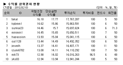 대회 한 달이 지난 현재 상위권자의 순위는 takal 회원이 16.18%의 수익률로 지난주에 이어 정상의 자리를 지키고 있으며, sunkai23회원이 전주 4위에서 근소한 차이로 3위를 기록했고, minimin1회원이 전주 3위에서 이번주에는 4위로 밀려나는 등 중상위권 순위가 조금씩 변동되는 모습을 보였다.