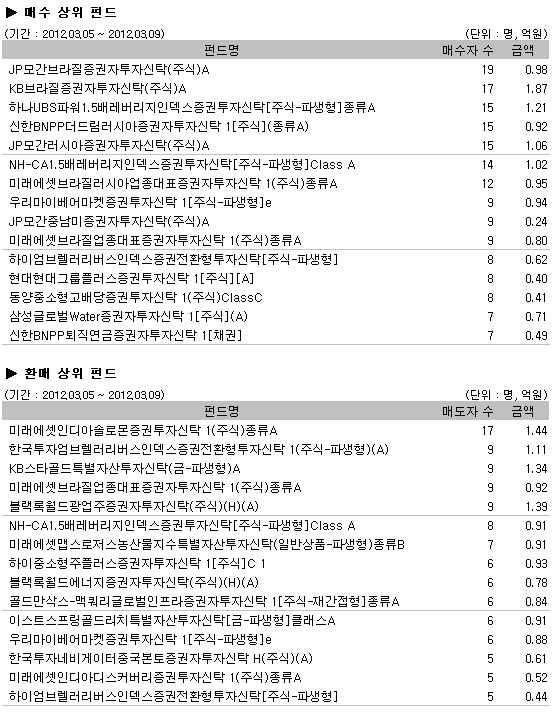지난주 브라질주식펀드의 큰폭의 하락에도 불구하고 매수상위펀드 1위는 19명의 매수자를 기록한 ‘JP모간브라질증권자투자신탁(주식)A’ 가 차지했다. 뒤를 이어 ‘KB브라질증권자투자신탁(주식)A’ 가 매수자수 17명으로 매수 2위를 기록했고 ‘하나UBS파워1.5배레버리지인덱스증권투자신탁[주식-파생형]종류A’ 가 매수자수 15명으로 매수 3위에 이름을 올렸다. 또한 지난 7개월간 최고치를 기록했던 러시아주식펀드가 차익매물을 쏟으면서 급락하는 모습을 보였지만 ‘신한BNPP더드림러시아증권자투자신탁 1[주식](종류A)’ 와 ‘JP모간러시아증권자투자신탁(주식)A’ 는 매수자 수 각각 15명으로 4,5위에 이름을 올리는 결과를 보여줬다.
