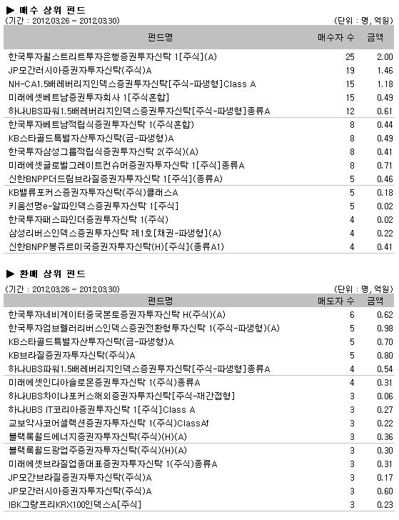 매수상위 펀드에서는 다른 유형에 비해 상대적으로 덜 하락한 한국투자월스트리트투자은행증권투자신탁 1[주식](A)’ 금융섹터펀드가 25명의 매수자로 매수1위를 기록했고‘JP모간러시아증권자투자신탁(주식)A’19명의 매수자로 매수2위를 기록했다. 또한 상승장에 대한 기대감을 반영한‘NH-CA1.5배레버리지인덱스증권투자신탁[주식-파생형]Class A'15명의 매수자로 매수3위에 올랐으며하나UBS파워1.5배레버리지인덱스증권투자신탁[주식-파생형]종류A’12명의 매수자로 매수5위를 기록했다. 오랜만에 동남아주식펀드가 강세를 보임에 따라미래에셋베트남증권투자회사 1[주식혼합]' 한국투자베트남적립식증권투자신탁 1(주식혼합)’이 각각 15명과, 8명의 매수자로 4위와 6위를 기록했다.