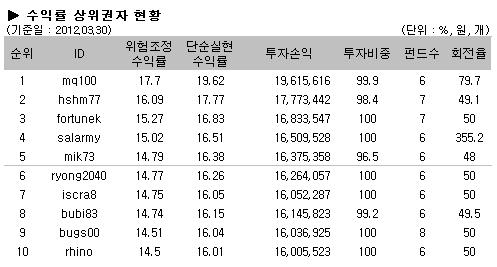 대회순위는 국내외 주식시장의 움직임에 따라 소폭 변동이 있었다. 지난주 1위와 2위를 기록했던 mq100회원과 hshm77회원이 각각 17.7% 수익률과, 16.09% 수익률로 이번주에도 부동의 1,2위를 기록했고, 이번주 3위에 오른 fortunek 회원은 15.27% 수익률로 지난주에 비해 1단계 상승한 결과를 보여줬다. 또한 지난주 9위를 기록했던 salarmy 회원이 15.02% 수익률로 이번주에는 5단계 상승하여 4위를 기록했다.