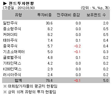 참가회원의 투자현황은 중국주식펀드와 기초소재섹터펀드의 비중이 줄어드는 가운데 테마주식펀드와 일반주식펀드의 비중이 조금씩 증가하는 모습을 보였다. 중국주식펀드는 0.2%p 빠졌고, 기초소재섹터펀드 또한 0.15%p 감소했다. 반면 테마주식과 글로벌주식펀드의 비중이 각각 0.1%p 증가하는 모습을 보였고, 전체적으로 증시가 하락함에 따라 수익률이 떨어지는 펀드의 비중을 낮추는 모습을 볼 수 있었다.
