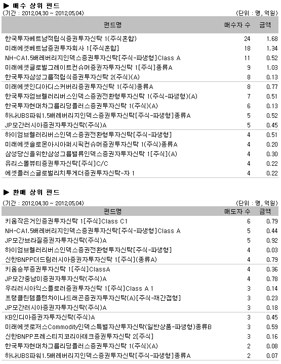 이번주 매수상위펀드는 동남아주식펀드 강세에 따라 베트남주식펀드가 차지했다. ‘한국투자베트남적립식증권투자신탁 1(주식혼합)” 이 24명의 매수자로 매수1위에 이름을 올렸고 ‘미래에셋베트남증권투자회사 1[주식혼합]’ 이 18명의 매수자를 기록하며 매수2위를 기록했다. 지난주와 마찬가지로 ‘NH-CA1.5배레버리지인덱스증권투자신탁[주식-파생형]Class A’ 가 매수 3위를 기록하며 박스권 장세속에서 상승반전의 기회를 엿보는 듯한 모습이었다.