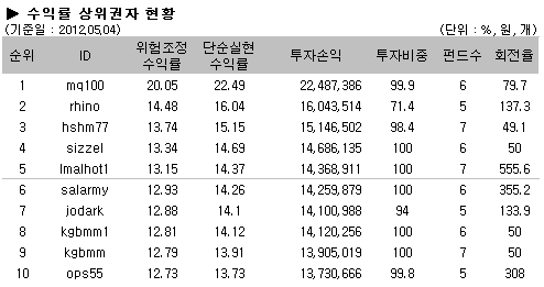 [2012/05/07 대회시황] 국내외 주식형펀드 상승, 대회수익률은 주춤...