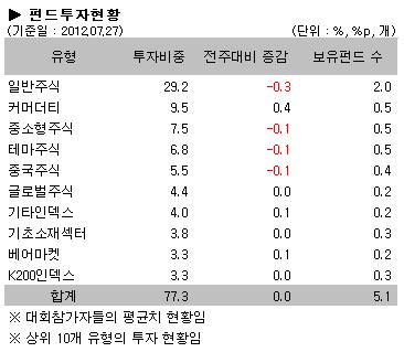 참가회원의 투자현황은 대부분의 국내외 주식형펀드들이 마이너스 수익률을 기록하면서 일반주식펀드가 0.3%P감소했고 중소형주식펀드도 0.1%P 줄었다. 중국주식펀드의 경우 3분기 GDP 성장률이 비관적으로 전망돼 0.1%P비중이 축소됐다. 반면, 상대적으로 선전한 커머더티펀드의 경우 양보합의 수익률을 기록하면서 0.15%P 비중이 증가됐다. 이밖에 기타 인덱스와, 베어마켓펀드도 각각 0.1%P 늘어났다.