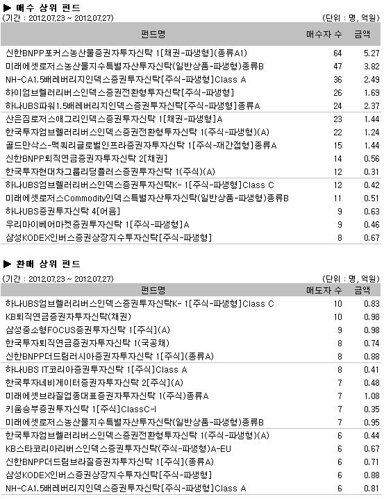 매수상위펀드는 지난주와 마찬가지로 커머더티펀드와 레버리지인덱스 펀드의 강세가 이번주에도 나타났다. “신한BNPP포커스농산물증권자투자신탁 1[채권-파생형](종류A1)” 과 “미래에셋로저스농산물지수특별자산투자신탁(일반상품-파생형)종류B” 가 강한 매수세로 인해 1위,3위에 각각 이름을 올렸다. “NH-CA1.5배레버리지인덱스증권투자신탁[주식-파생형]Class A” 와 “하나UBS파워1.5배레버리지인덱스증권투자신탁[주식-파생형]종류A” 가 각각 36명과 24명의 매수자로 매수3위와 5위를 기록했다.