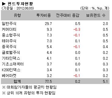 참가회원의 투자현황은 국내외 대부분의 유형들이 플러스 수익률을 기록했다. 특히, 상대적으로 높은 성과를 보여줬던 국내주식펀드의 비중이 증가됐고 해외주식펀드의 경우 비중이 축소되는 결과를 볼 수 있었다. 일반주식펀드의 경우 0.5%p 증가됐고, 테마주식, 기타인덱스 펀드는 각각 0.1%p 늘었다. 반면, 커머더티펀드의 경우 해외펀드 중 가장 낮은 상승폭을 기록하면서 0.3%p 비중이 축소된 결과를 보여줬다. 이 밖에도 중소형주식펀드, 중국주식펀드는 각각 0.1%p 줄었고, 베어마켓 또한 0.1%p 축소됐다.