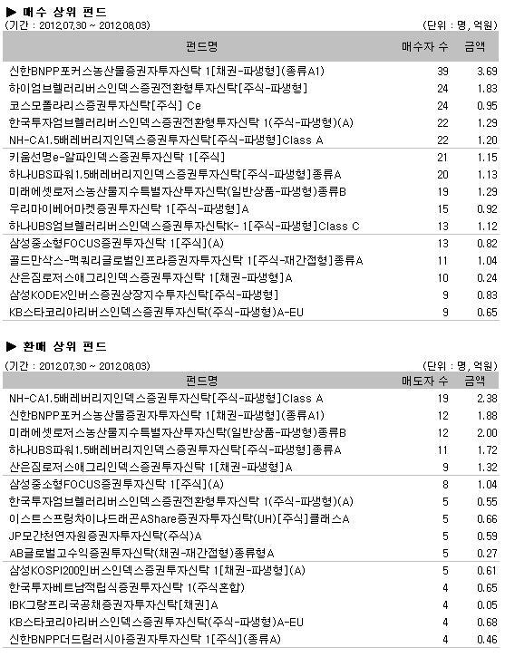 매수상위펀드는 커머더티펀드와 엄브렐러리버스펀드가 주류를 이뤘다. 매수상위펀드의 경우 지난주보다 매수자수, 거래금액은 줄었고 환매상위펀드의 경우 매도자수, 거래금액이 증가됐다. 매수1위는 지난주에 이어 “신한BNPP포커스농산물증권자투자신탁 1[채권-파생형](종류A1)” 가 이름을 올렸고 매수2위는 “하이엄브렐러리버스인덱스증권전환형투자신탁[주식-파생형]” 펀드가 24명의 매수자를 기록했다. 신규펀드로 “코스모폴라리스증권투자신탁[주식] Ce” 가  24명의 매수자로 매수3위를 기록했고 “한국투자엄브렐러리버스인덱스증권전환형투자신탁 1(주식-파생형)(A)” 가 22명의 매수자로 매수4위에 이름을 올렸다.