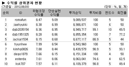대회 한 달이 지난 현재 상위권자 순위는  romafun 회원이 8.47%의 수익률로 정상의 자리를 지키고 있으며, 전주4위를 기록했던 jaehyukki 회원이 8.38% 수익률로 2위에 머물렀다. 3위 역시 전주 5위에 올랐던 dgb2035154 회원이 8.36% 수익률을 기록했고, dgb1951325 회원이 8.28% 수익률로 4위를 지키고 있다. 상위권자 수익률 모두 근소한 차이를 보이면서 중상위권 순위가 조금씩 변동되는 모습을 보였였다.