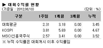 미국 경제지표 개선과 유럽의 경기 부양 기대감의 영향으로 투자심리가 개선되면서 국내외 주식형펀드 모두 플러스 성과를 기록했다. KOSPI 지수는 전주대비 3.81% 상승했고 MSCI 신흥국 주식 역시 2.57% 상승했다. 마찬가지로 대회평균 수익률도 2.31% 수익률을 보여준 한 주였다.