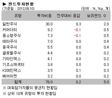 참가회원의 투자현황은 국내외 대부분의 유형들이 플러스 수익률을 기록하면서 지난주와 비슷한 양상을 보여줬다. 일반주식펀드와 K200인덱스펀드의 강세가 이어지는 가운데 이들의 투자비중도 전주대비 각각 0.3%p, 0.1%p 증가됐다. 상대적으로 낮은 성과를 보여준 중소형주펀드가 0.1%p 감소됐고, 뒤를 이어 커머더티펀드도 0.1%p 감소하는 결과를 보여줬다.