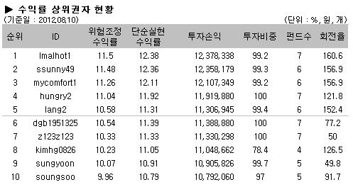 국내시장이 연속으로 상승함에 따라 상위권자 순위도 대폭 변동이 있었다. 새롭게 등장한 lmalhot1 회원이 11.5%의 수익률로 정상의 자리로 올라섰고, ssunny49 회원이 11.48% 수익률로 그뒤를 이었다. 3위 역시 새롭게 등장한 mycomfort1 회원이 11.26% 수익률을 기록하고 있으며,  hungry2 회원이 11.04% 수익률로 4위에 이름을 올렸다. 상위권자 수익률 모두 근소한 차이를 보이면서 매주 순위변동이 심한 양상을 보여주고 있다.