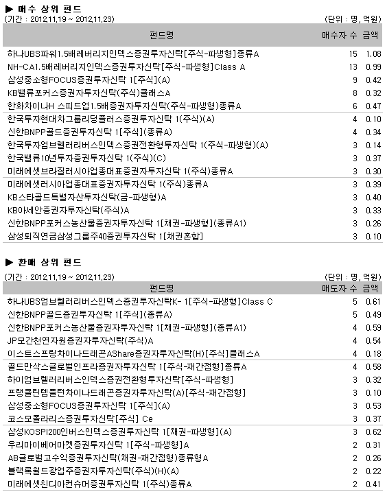 이번주 매수상위펀드는 중소형주펀드의 부진에도 불구하고, 레버리지인덱스펀드와 중소형주펀드가 상위권을 차지했다. “하나UBS파워1.5배레버리지인덱스증권투자신탁[주식-파생형]종류A” 펀드가 15명의 매수자로 매수1위에 이름을 올렸고, 2위는 “NH-CA1.5배레버리지인덱스증권투자신탁[주식-파생형]Class A” 펀드가 13명의 매수자를 기록했다. 3위는 중소형주펀드인 “삼성중소형FOCUS증권투자신탁 1[주식](A)” 펀드가 9명의 매수자를 기록하면서 중소형주펀드의 부진에도 불구하고 상위권에 이름을 올렸다.