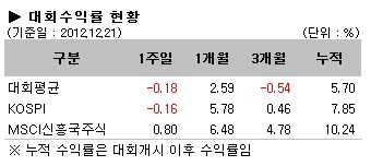 미 재정절벽 협상 합의 기대 속에 2000p 돌파 시도가 이어졌던 주식시장이 주후반 합의 지연에 대한 우려로 급락하며 5주만에 하락 반전했다. KOSPI 지수는 -0.16% 수익률을 기록하며 상승세를 반환했고, MSCI 신흥국지수는 0.80% 상대적으로 양호한 수준을 보여줬다. 대회평균 수익률도 -0.18% 보합세를 유지하며, 코스피 지수와 유사한 성과를 기록했다.
