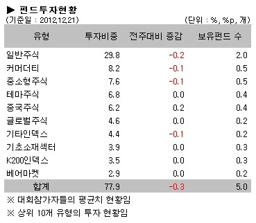 국내외 주식형펀드가 한주간 엇갈린 성과를 보여주면서 참가회원들의 투자현황도 이를 반영했다. 일반주식펀드의 약세가 이어지면서  참가회원들의 투자비중도 0.2%p 감소됐다. 중소형주식펀드의 4주째 약세흐름에 따라 투자비중도 0.1%p 감소됐고, 해외주식펀드 중 커머더티펀드가 가장 부진한 수익률을 기록하며 비중도 0.1%p 줄었다.