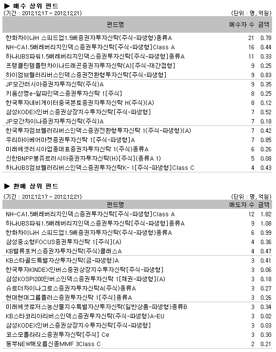 환매상위펀드에서는 마찬가지로 레버리지인덱스펀드와 중소형주펀드가 상위권을 차지했다. “NH-CA1.5배레버리지인덱스증권투자신탁[주식-파생형]Class A”, “하나UBS파워1.5배레버리지인덱스증권투자신탁[주식-파생형]종류A” 가 각각 12명, 9명의 매도자로 환매2위와 3위를 기록했고, “한화차이나H 스피드업1.5배증권자투자신탁(주식-파생형)종류A” 펀드가 6명의 매도자로 환매 3위를 기록했다.