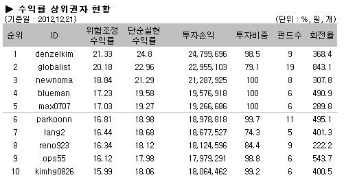 대회 마지막주에 이르러 지난주와 큰 변동 없는 결과를 보여줬다. denzelkim 회원이 21.33% 수익률로굳건하게 1위를 지키고 있으며, 2위는 globalist 회원이 20.18% 수익률로 지난주와 동일한 순위를 기록했다. 3위는 newnoma 회원이, 4위는 blueman 회원이 지난주와 변함없는 순위를 기록했다.