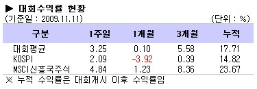코스피 지수가 상승세를 보임에 따라 대회 수익률도 한주만에 상승반전했다. 지난 한주간 대회평균 수익률은 3.25%로 코스피지수 상승률인 2.09%보다 양호한 성과를 기록했다. 그러나 MSCI신흥국주식 지수보다는 1.59%포인트 낮았다.