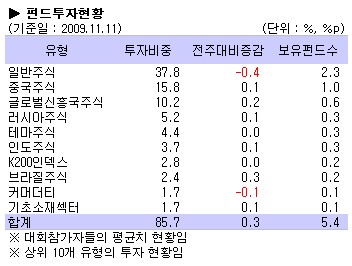 한 주간 국내 증시 상승세에도 불구하고 일반주식펀드의 투자비중은 0.4%포인트 줄어들었다. 반대로 브라질주식펀드와 글로벌신흥국주식펀드는 각각 0.3%포인트, 0.2%포인트 투자비중이 늘어났다.