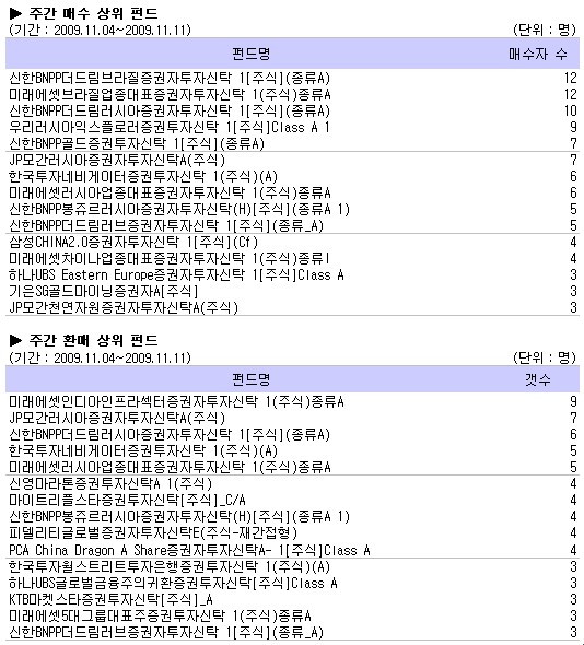 러시아, 브라질주식펀드의 인기가 여전히 이어진 한 주였다. 펀드별로는 ‘신한BNPP더드림브라질증권자투자신탁 1[주식](종류A)’, ‘미래에셋브라질업종대표증권자투자신탁 1(주식)종류A’, ‘신한BNPP더드림러시아증권자투자신탁 1[주식](종류A)’순으로 매수세가 높았다.