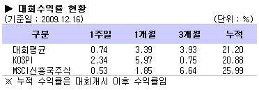 대회평균 수익률이 2주연속 상승흐름을 이어갔다. 국제통화기금(IMF)이 한국의 내년 경제성장률을 4.4%로 상향 조정하는 등 호재에 힘입어 코스피지수는 한주간 2.34%를 기록했다. 그러나 MSCI신흥국주식펀드는 이보다 1.81%포인트 낮은 0.53% 상승에 그쳤다.