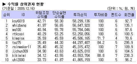 상위 10위권 내에서는 가벼운 자리변동만 있었다. 직전주에 이어 ksy6019 회원이 2주연속 1위 자리를 지켰다. 이 회원은 58.30%(위험조정수익률 42.71%)의 단순실현수익률을 기록했다. 이어 whizbang 회원이 0.74%(위험조정수익률) 차이로 그 뒤를 바짝 쫓았다.