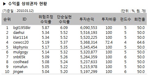 bgt1958kr 회원이 5.87%(단순실현수익률 6.09%)의 위험조정수익률로 1위를 기록했고 daehui, klar1114 회원이 각각 0.53%포인트(위험조정수익률 기준)차이로 뒤를 이었다. 전체적으로는 1월 12일 기준으로 총 1,910명의 참가자 중 54명이 마이너스 수익률을 기록한 것으로 나타났다.
