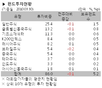 유형별 펀드투자비중은 지난주와 비슷하게 나타났다. 브라질주식펀드가 증시약세로 인해 0.2%포인트 비중이 축소됐고, 일반주식과 글로벌신흥국주식이 각 0.1%포인트씩 비중이 줄어들었다. 러시아주식과 아시아신흥국주식펀드는 각 0.1%포인트씩 비중이 늘어났다.