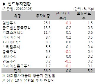유형별 투자비중은 국내증시의 상승에도 불구하고 일반주식펀드의 비중이 0.3%포인트 줄어들었다. 이외에 중국, 인도주식펀드도 각 0.1%포인트씩 비중이 축소됐다. 이와는 반대로 글로벌신흥국, 러시아주식펀드는 각 0.2%포인트씩 비중이 늘어나는 모습을 보였다.