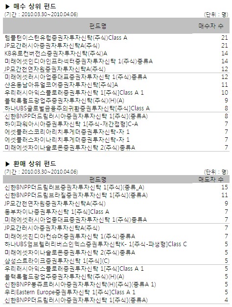 반대로 매도는 ‘신한BNPP더드림러브증권자투자신탁 1[주식](종류_A)’, ‘신한BNPP더드림브라질증권자투자신탁 1[주식](종류A)’등이 많았다.