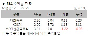 한주간 코스피지수와 MSCI신흥국주식이 각각 2.90%, 3.31% 상승함에 따라 대회수익률도2.20%를 기록했다.