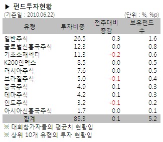 유형별 투자비중은 직전주와 거의 비슷한 가운데 일반주식펀드가 0.3%포인트, 테마주식펀드와 중국주식펀드가 각 0.1%포인트 상승했다. 반면 기초소재섹터펀드 -0.2%포인트, 브라질주식펀드 각 -0.1%포인트 등 투자비중이 소폭 줄어들었다.