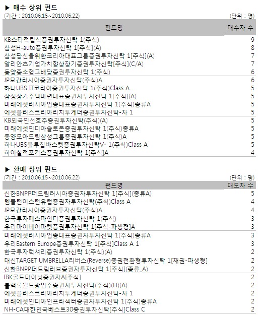 최근 계속해서 국내펀드의 인기가 이어지고 있다. 매수자 수가 조금 줄어들긴 했지만 지난 한 주 동안에도 매수상위 펀드는 거의 국내펀드가 휩쓸었다. 펀드별로는 ‘KB스타적립식증권투자신탁 1(주식)’, ‘삼성H-auto증권투자신탁 1[주식](A)’순으로 매수세가 높았다.