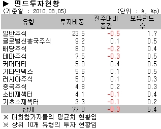 직전주에 이어 국내주식 펀드의 투자비중이 대폭 줄어들었다. 일반주식펀드는 0.5%포인트 비중이 축소됐고, 배당주식펀드와 테마주식펀드도 각각 0.2%포인트, 0.3%포인트씩 축소됐다. 반면 밀 값 급등에 힘입어 커머더티펀드의 투자비중은 0.4%포인트 증가했다.