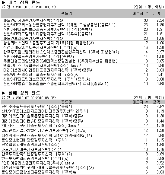 반면 금펀드는 계속되는 금값 하락으로 인해 3주째 환매가 이어졌다. 인도주식펀드와 IT주 관련펀드도 환매가 많았다. 펀드별로는 ‘신한BNPP골드증권투자신탁 1[주식](종류A)’의 환매가 많았고, ‘신한BNPP프레스티지코리아테크증권투자신탁 2[주식]’, ‘미래에셋인디아솔로몬증권투자신탁 1(주식)종류A’, ‘미래에셋친다이컨슈머증권투자신탁 1(주식)종류A’도 매도강세를 보였다.