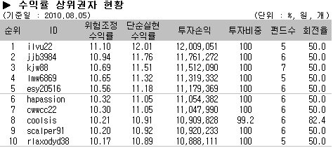 [2010/08/05 대회시황] 대회 수익률 2주째 상승세 기초소재섹터펀드 강세