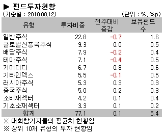국내주식 펀드의 투자비중이 줄어든 한 주였다. 일반주식펀드는 0.7%포인트 비중이 축소됐고, 배당주식펀드와 테마주식펀드도 각각 0.2%포인트, 0.4%포인트씩 축소됐다. 반면 최근 농산물가격 상승에 커머더티펀드의 투자비중은 각 0.8%포인트씩 증가했다.