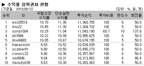 esy20516회원이 10.70% (단순실현수익률 11.36%)의 위험조정수익률로 1위로 올라섰다. 전주 1위였던 ilvu22회원은 10.45%차이로 2위를 기록했다. song1004회원은 리버스펀드와 현금자산의 투자비중이 높아 최근 약세시장에서 선방하며 직전주 20위에서 3위로 순위가 급상승해 눈길을 끈다
