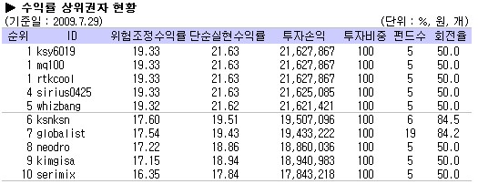 대회 시작 이후 계속해서 러시아 펀드에 집중투자하고 있는 ksy6019, mq100, rtkcool 이 여전히 공동 1위를 차지하고 있고 교체매매를 실시한 ksnksn과 globalist는 각각 6위와 7위로 밀려났다. Ksnksn는 러시아 펀드의 일부를 환매해 커머더티 펀드로 갈아탔고 globalist 역시 펀드 일부를 환매해 국내와 이머징 펀드로 분산해 투자했다.