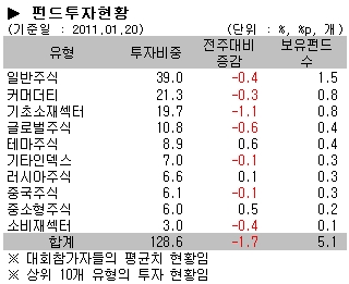 참가회원의 포트폴리오는 다소 변화가 발생한 것으로 나타났다. 기초소재섹터펀드가 -1.1%p 빠지며 가장 많이 줄어들었고, 글로벌주식펀드와 일반주식펀드, 소비재섹터펀드가 각각 0.6%p와 0.4%p씩 감소하는 등 국내외를 막론하고 대부분의 유형에서 비중이 축소됐다. 반면 국내 테마주식펀드와 중소형주식펀드는 0.6%p와 0.5%p씩 증가하는 모습을 보였다.