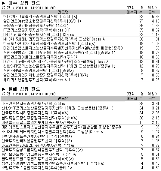 전주에 이어 ‘현대현대그룹플러스증권투자신탁 1[주식][A]’가 매수자 수 92명으로 가장 많이 매수된 펀드의 자리를 지켰다. ‘알리안츠Best중소형증권투자신탁[주식](C/C1)’ 또한 전주에 이어 매수자수 77명으로 높은 매수세를 보였다.