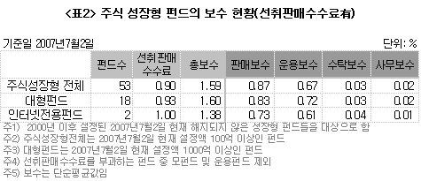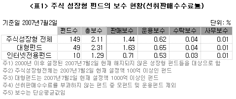 펀드 보수에 대한 논의를 위해 주식 성장형 펀드의 보수를 분석했다. 2000년 이후 설정된 개인투자자들이 가입할 수 있는 공모펀드 중 선취판매수수료를 부과하지 않는 경우와 부과하는 경우를 나눴다. 선취판매수수료를 부과하지 않는 경우 운용보수의 평균은 0.62%로 총보수의 29%가량을 차지했다. 판매보수의 평균은 1.44%로 총보수의 67% 가량을 차지했으며 이는 운용보수의 두 배를 넘는 규모였다.