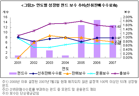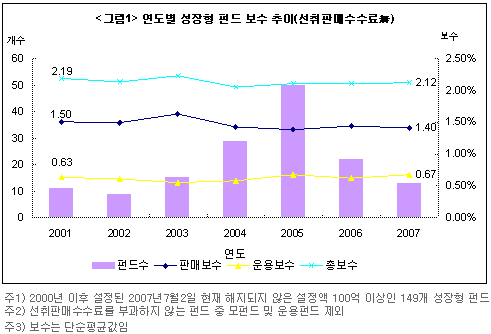 연도별 성장형 펀드 보수 추이를 살펴보면 2001년 이후 6년 동안 총보수가 0.07%포인트 정도 감소했음을 알 수 있다. 운용보수, 수탁보수, 사무보수가 일정한 수준으로 유지되는 상황에서 총보수의 감소는 판매보수의 감소 추세와 관련이 있다. 총보수가 2001년 2.19%에 2007년 2.12%로 0.07%포인트 감소하는 동안 운용보수는 0.63%에서 0.67%로 0.04%포인트 증가했지만 판매보수는 1.5%에서 1.4%로 0.1%포인트 감소했다.
