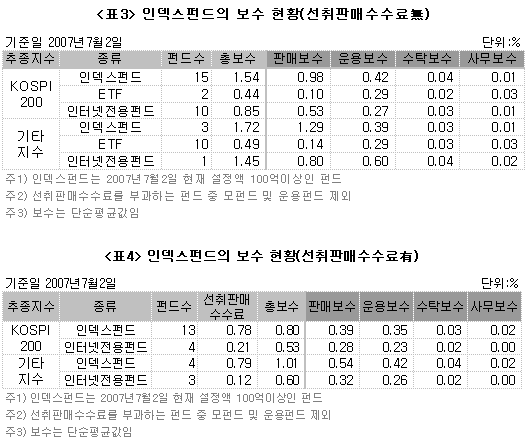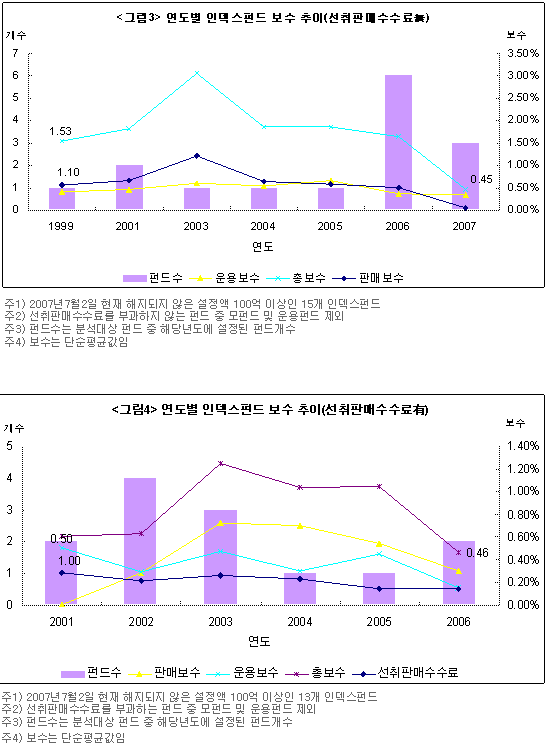 연도별 인덱스펀드 보수 추이를 살펴보면 성장형펀드와 마찬가지로 총보수가 감소 추세다. 인덱스펀드의 경우 운용보수와 판매보수의 차이가 적으며 선취판매수수료를 부담하지 않는 펀드의 경우 2007년에는 역전되는 모습을 보여준다.  총보수의 감소는 판매보수의 감소 외에도 최근 3년간의 운용보수 감소와도 관련이 있다. 특히 2005년 이후 3년간의 감소폭이 큰데, 선취판매수수료를 부담하지 않는 펀드의 경우 2005년 1.85%였던 총보수는 2007년 0.45%로 대폭 낮아졌다. 이는 같은 기간 판매보수와 운용보수가 각각 1.15%에서 0.07%로, 0.65%에서 0.34%로 낮아졌기 때문이다.