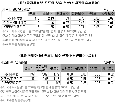 2007년 들어서 폭발적인 증가세를 보이고 있는 국제주식형 펀드의 보수 현황이 어떠한지 분석해봤다. 국제주식형펀드의 경우 외국시장에 대한 리서치 인력부족으로 현지에 정통한 운용회사의 자문을 받거나 운용을 위탁하는 경우가 많다. 따라서 운용의 적극성 여부에 따라서 운용보수의 차이가 크게 나타날 수 있다. 펀드명에 ‘인덱스’나 ‘파생상품’을 명시하고 있는 소극적 운용을 하는 것으로 추정되는 펀드들의 경우 적극적운용을 하는 펀드들에 비해 운용보수가 0.32%~0.4%나 낮았다. 이는 성장형 펀드와 KOSPI200을 추종하는 인덱스펀드간의 운용보수 차이 0.2%~0.32%보다 더 컸다. 국제주식형 인터넷 전용펀드의 경우 인터넷 전용이 아닌 펀드에 비해서 판매보수가 0.48%~0.53% 저렴했다.