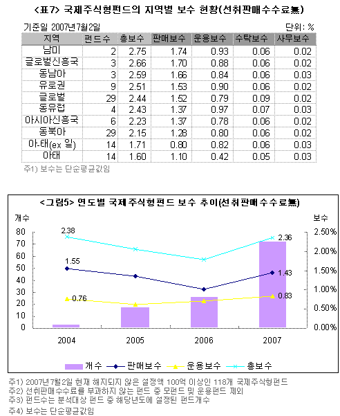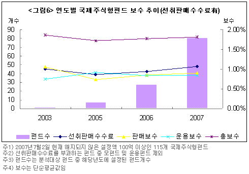 연도별로 국제주식형펀드의 보수 추이를 살펴보면 앞선 두 유형과는 상이한 양상을 보인다. 선취판매수수료를 부과하지 않는 펀드의 경우 펀드수가 적은 2004년을 제외하고 2005년 이후의 모습을 보면 운용보수는 꾸준히 증가하는 양상을 보여주고 있다. 2007년 들어 폭발적 증가세를 보이고 있는 국제주식형펀드는 투자지역이 다양해지면서 운용보수나 판매보수 모두 증가하는 추세를 보여주고 있다.
