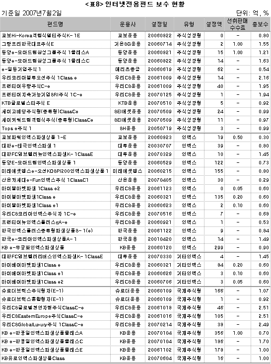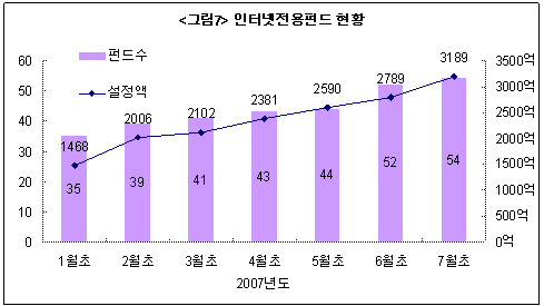 2007년 1월초만하더라도 1,468억에 불과하던 설정액이 7월초에는 3,189억으로 두 배 이상 증가한 모습을 보여주고 있다. 인터넷전용펀드는 가입시 상담을 거치지 않기 때문에 충분한 정보를 제공받지 못할 가능성이 있으므로 사전에 펀드의 투자대상이나 스타일, 운용사 성과 등을 충분히 살펴본 후 투자에 나서야 한다.