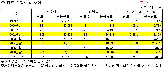 우리나라 대다수 인덱스펀드는 ‘코스피200지수’를 추종하는 펀드이나 최근 각종지수가 개발되면서 다양한 인덱스펀드가 선보이고 있다. 현재 전체 인덱스펀드 운용규모는 5조4천억원으로 전체 국내주식펀드 총액 중 10%를 차지한다. 미국과 비교하면 절대규모나 상대적 비중 면에서 모두 뒤처지나 미국의 인덱스 펀드역사가 30년 이상이라는 것을 감안하면 비교적 빠른 속도로 성장하고 있다. 특히 펀드 수는 1999년말 5개에서 최근 106개로 급증했고 종류도 10여종에 달한다. 최근 9년 사이에 한국의 인덱스펀드 시장은 약진을 뛰어넘어 급성장의 발판을 마련한 셈이다.
