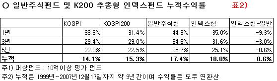 인덱스 펀드의 장점은 첫째 평균수익률 측면에서 일반주식펀드를 앞선다는 점, 둘째 펀드간 성과격차가 좁아 펀드 선택위험이 일반주식펀드에 비해 작다는 점이다. 우선 한국의 인덱스펀드가 과연 일반주식펀드 성과를 앞서고 있는지를 살펴보자.