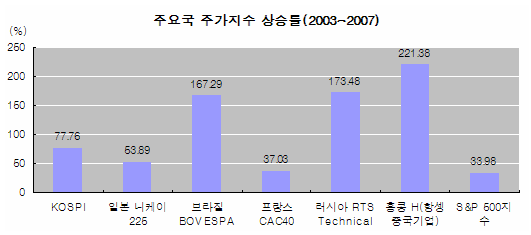 이에 대해 대부분 증권사들은 신흥시장의 투자와 소비가 선진국 경제에 도움을 주면서 2008년도 해외 증시는 신흥시장 주도로 성장세를 보일 것이라는 전망했다.