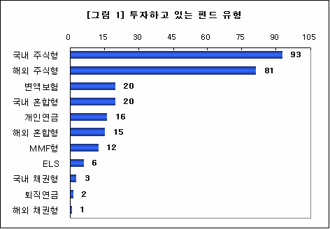 2006년에 이어 두번째로 실시한 이번 설문조사에 따르면 2007년에는 전년도에 비해 주식형 펀드에 대한 투자 비중이 높아졌던 것으로 나타났다. 2006년 국내주식형 펀드에 투자하고 있다고 답한 투자자들의 비중이 86%에서 2007년에는 93%까지 늘었다. 또한 직전년도에 해외주식형 펀드에 투자하고 있다고 답한 투자자가 68%에서 지난해에는 81%까지 늘어 눈길을 끌었다. (중복선택이 가능한 답변으로 총 합계는 100%가 넘을 수 있음)